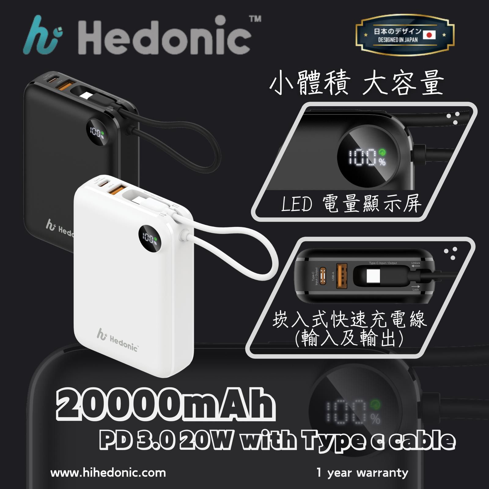 Hedonic PD 3.0 20000mAh USB-C Cable 流動充電池